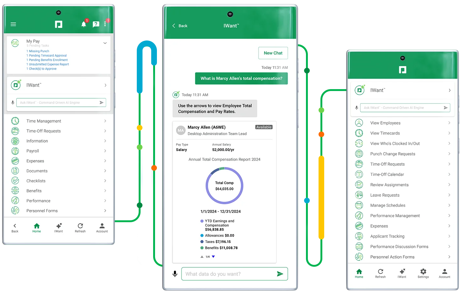 Paycom has revolutionized how users find and access employee data. Simply ask IWant™. The industry’s first command-driven AI engine in a single database searches employee profiles and management dashboards to deliver accurate answers in a flash. No navigation required.